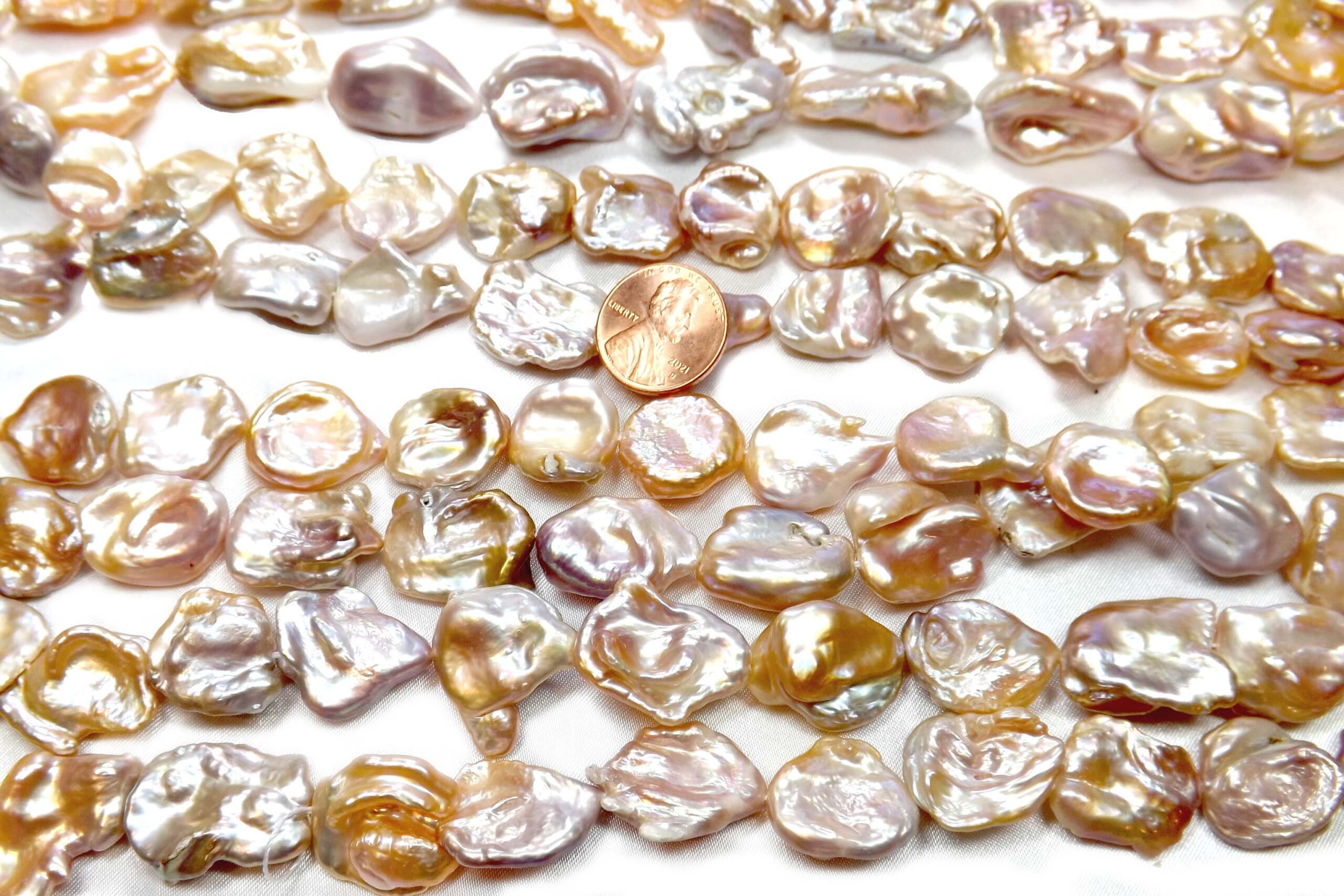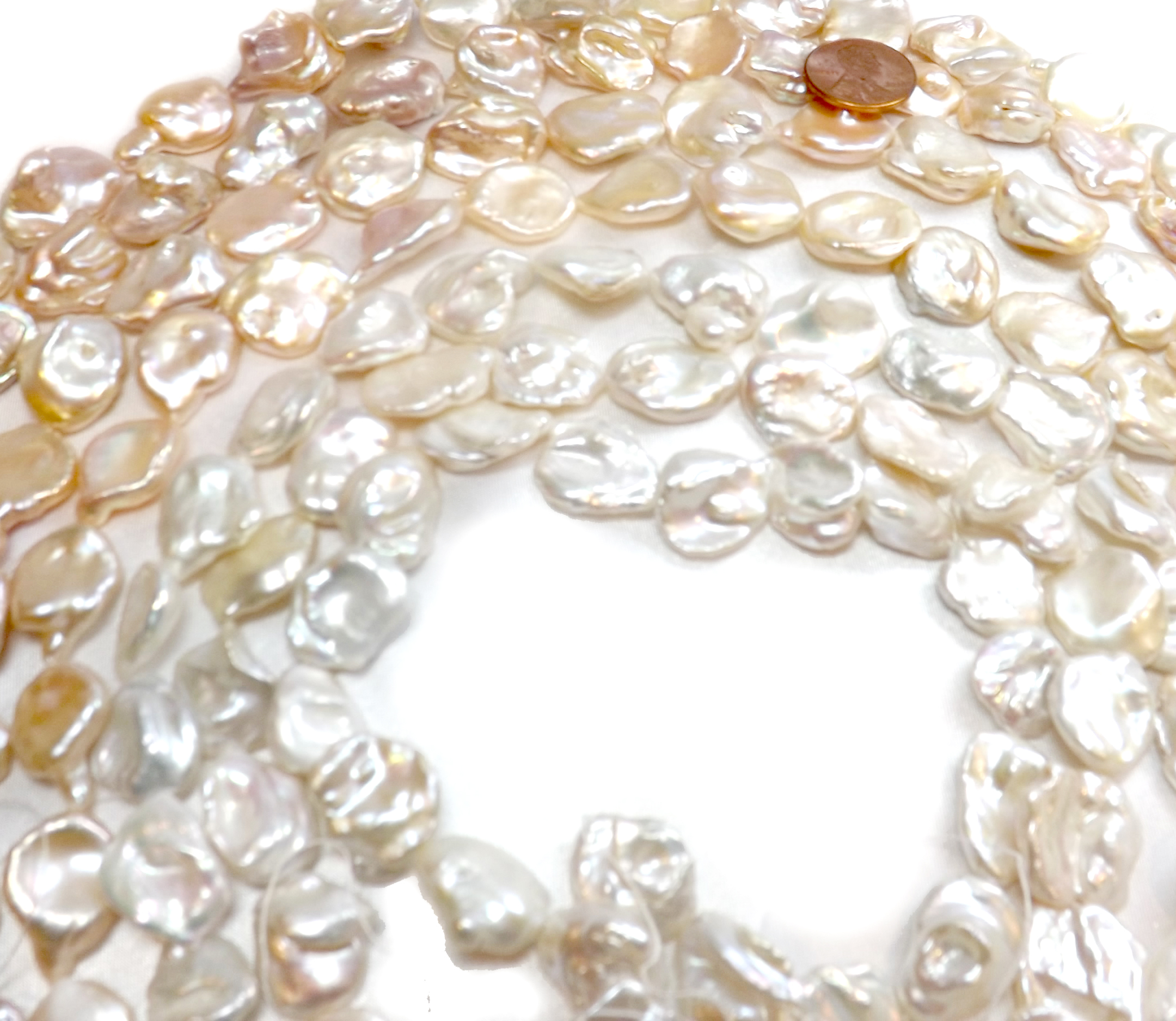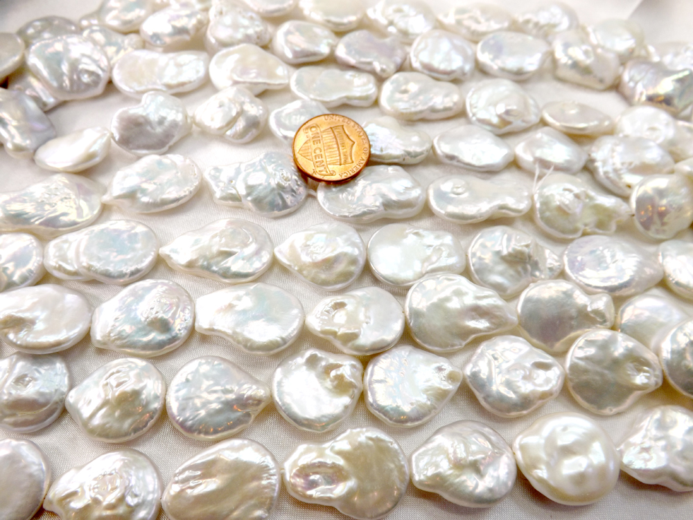 The strands are approximately 15-15.5″ inch long, with approximately 22 pearls are each strand. Perfect if you want to take the strand apart and use them individually as center piece as well, especially for the higher graded pearls. They would make very impressive jewelry due to their huge size and high luster, as well as unusual flat shapes.