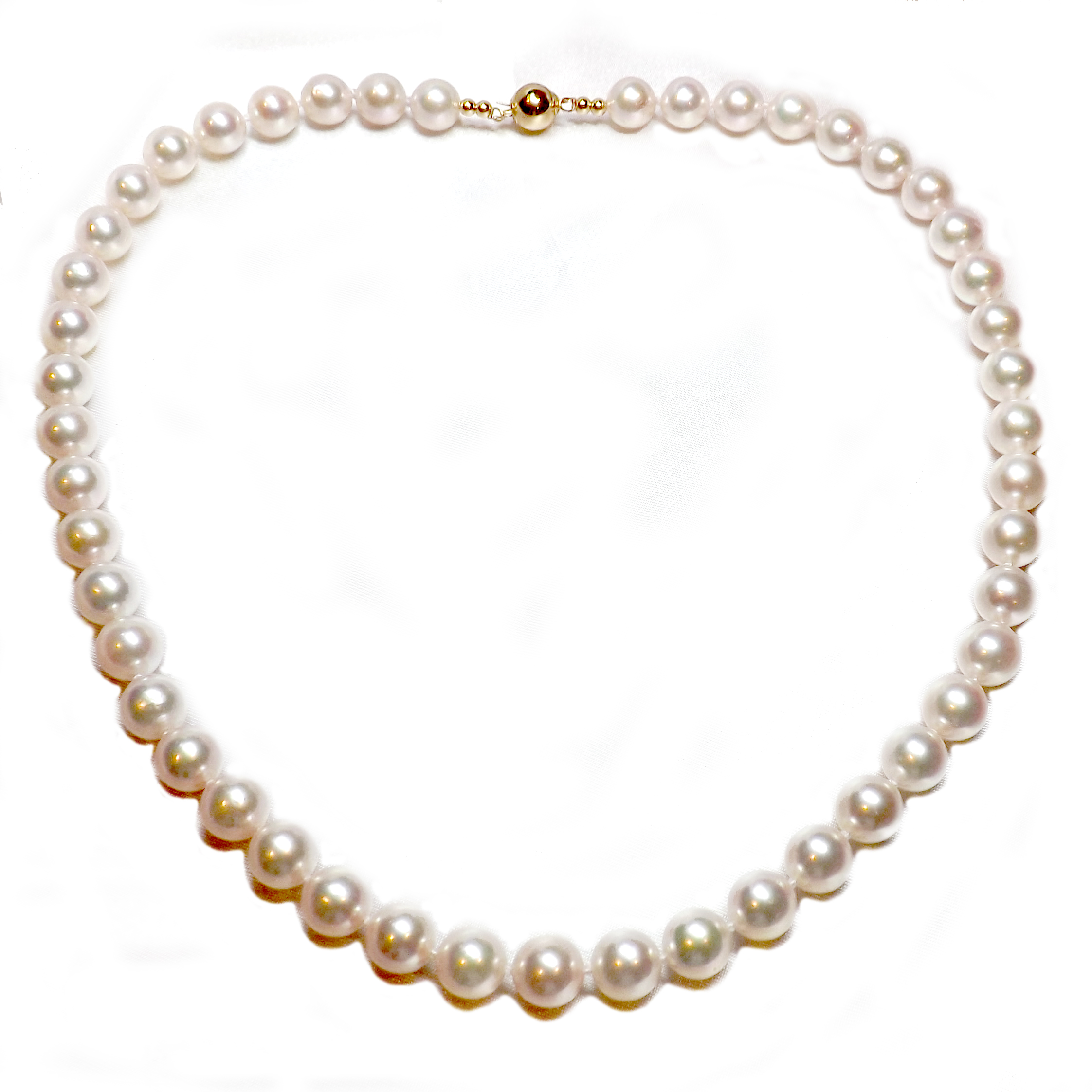 We use a 14k gold clasp in ball shape to finish this amazing 9-9.5mm Akoya Pearl Necklace. The clasp can be in either 14K white gold or 14K yellow gold of your choice. It is at an approximately 18″ Long.