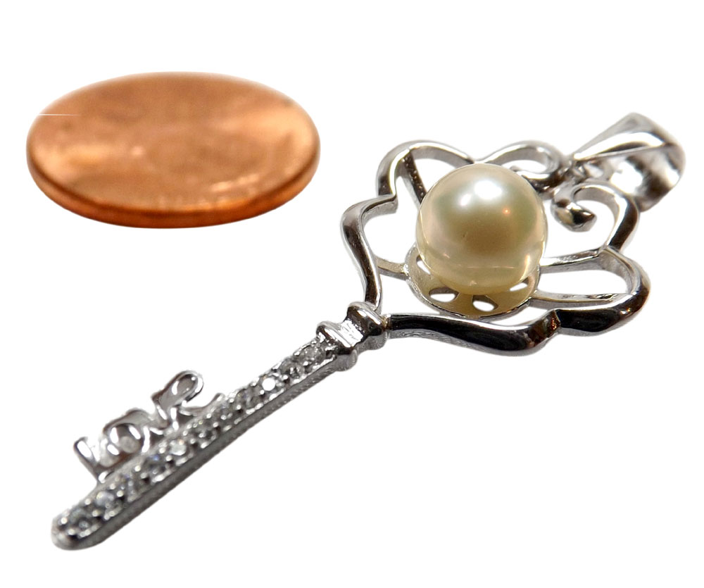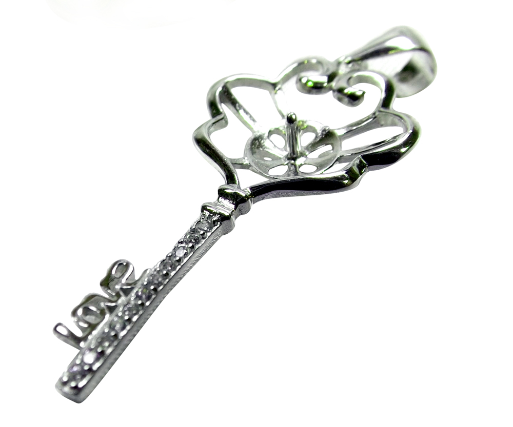 This beautiful key shaped large pearl pendant setting is made of 925 pure sterling silver. It weighs about 1.1gram, with no cz diamonds at a dimension of 5/8″ x 1 7/8″ (that is almost 2″).