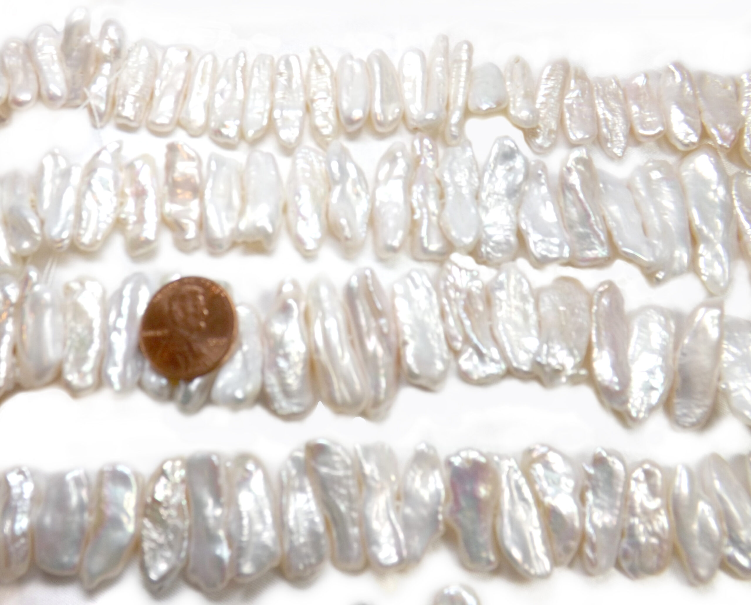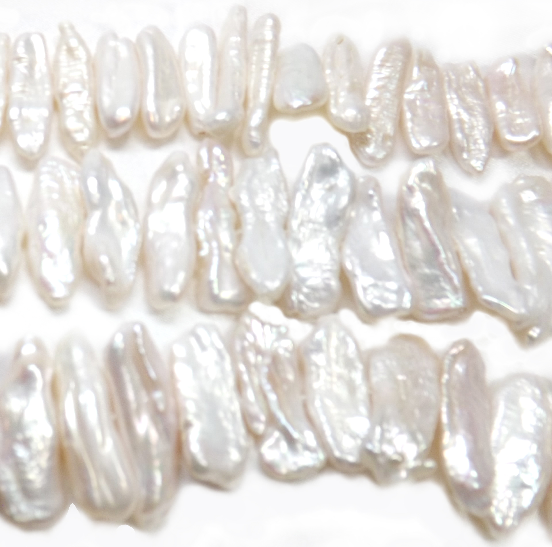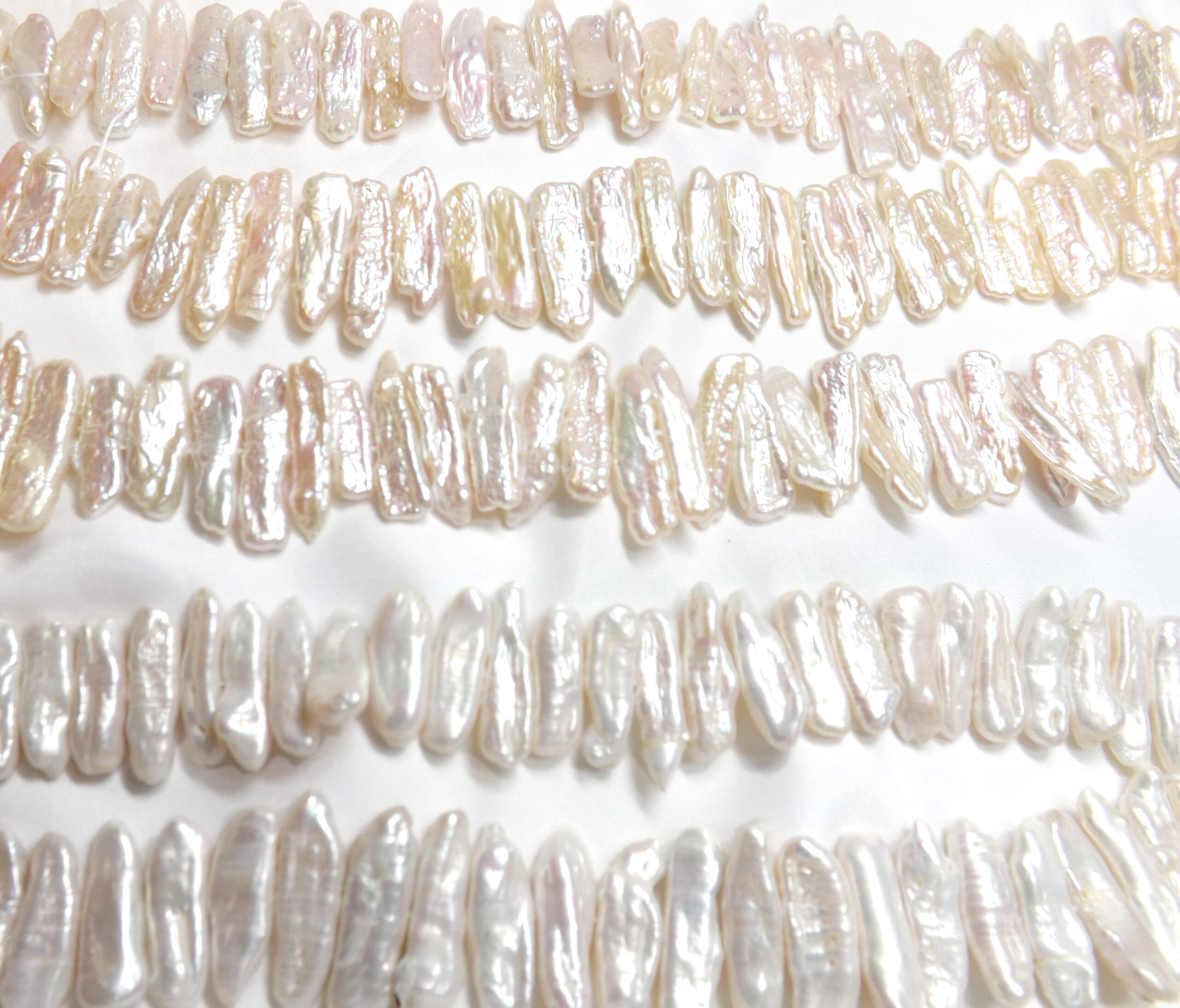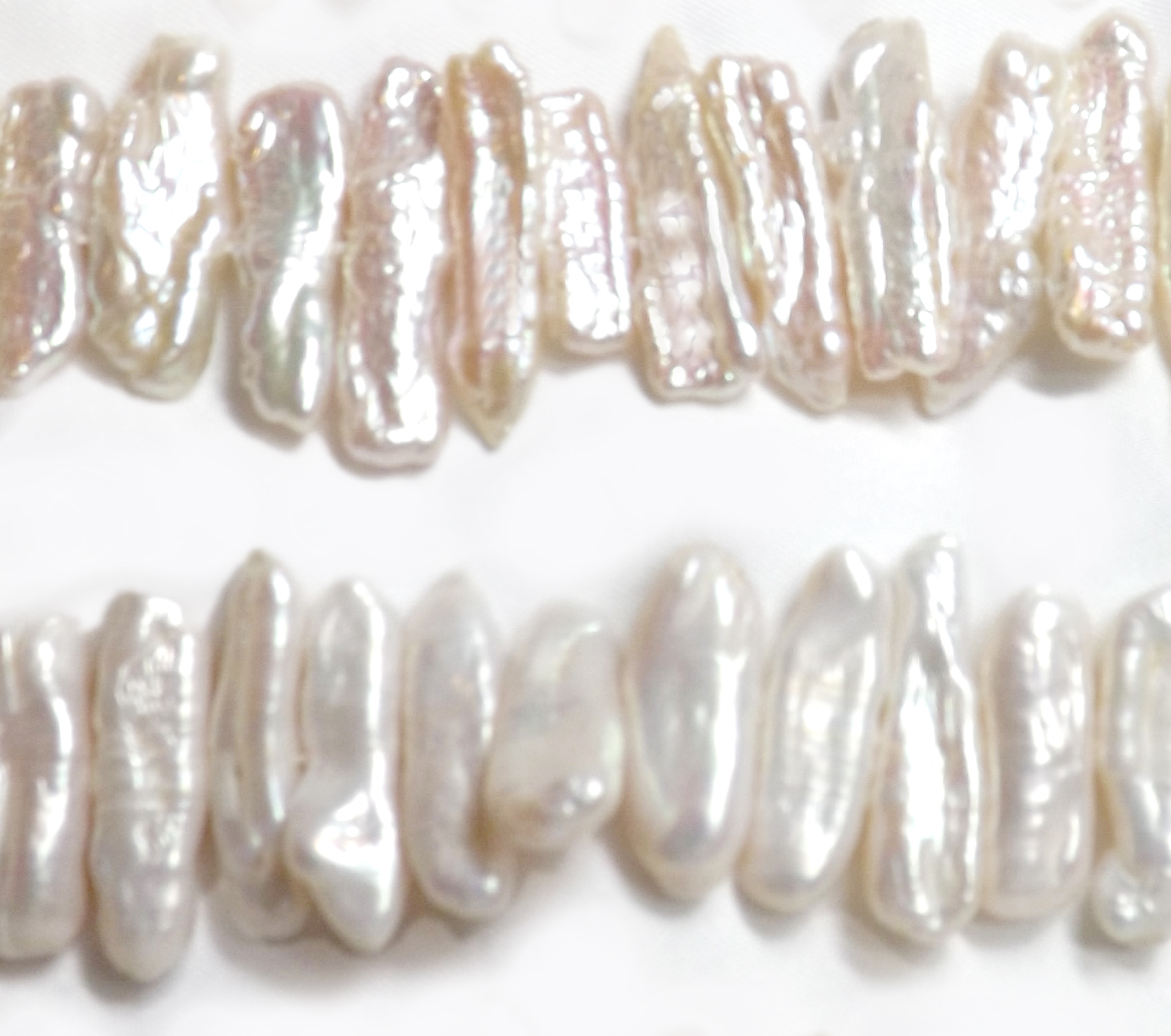 This is a beautiful, large and rare biwa white stick pearl strand that has been center-drilled. They are hard to come by with such high luster and large size. You can sell these center drilled biwa pearls individually. You can also make your jewelry by pieces as other stores do with enormous profit potential.