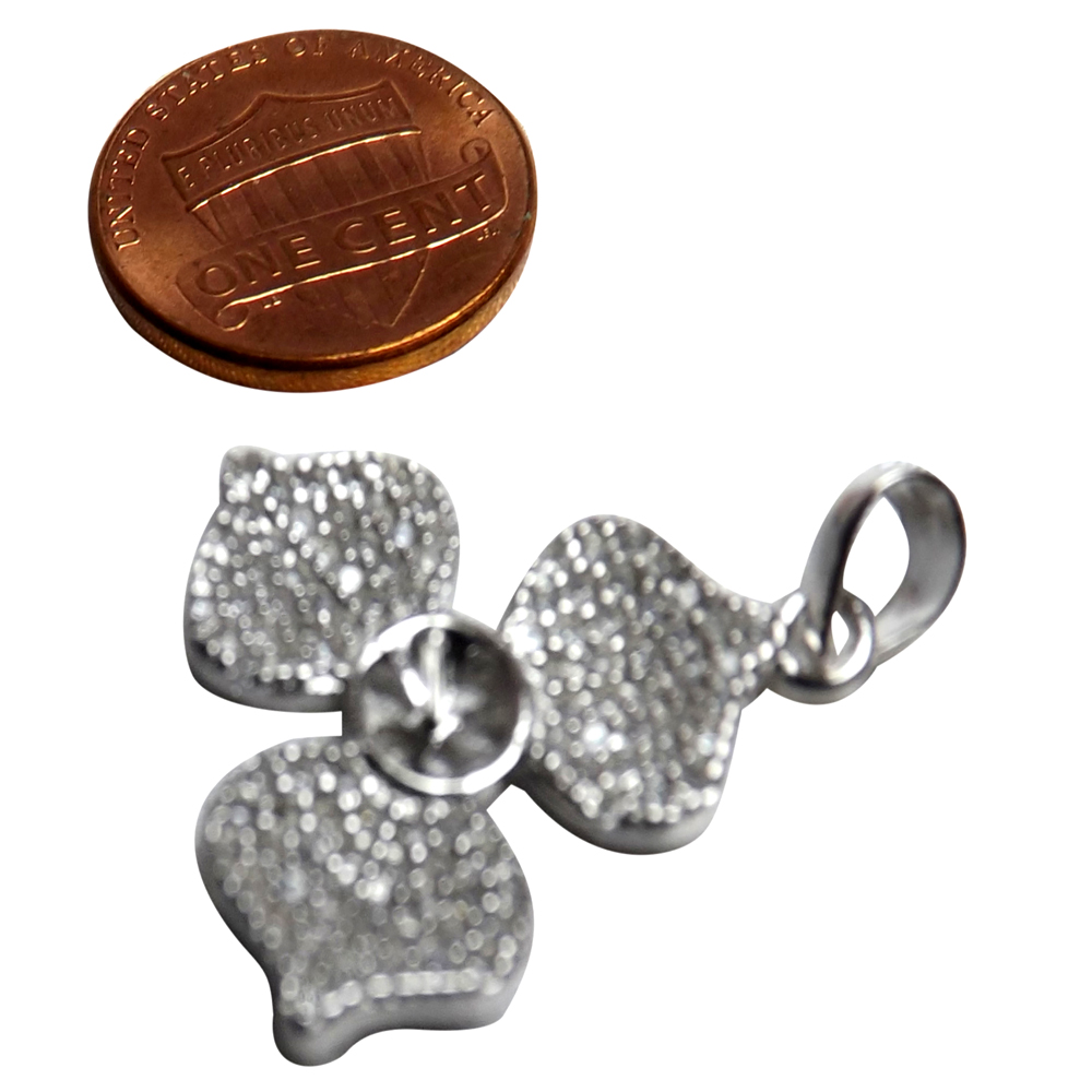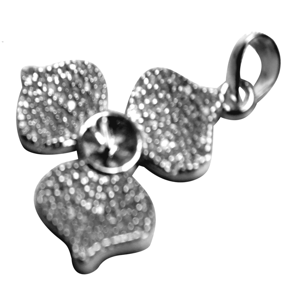 The sparkle from this clover shaped pendant setting is amazing! The entire clover is covered in tiny pave set lab created diamonds. All you have to do is add your 5-7mm pearl or other half-drilled stone, then a chain or cord up to 3mm in size, and you are ready to turn some heads!
