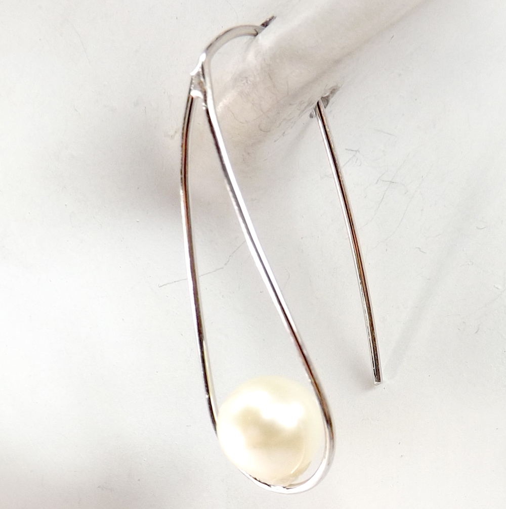 These drop pearl earrings are like pieces of modern art. The elongated teardrop shape and extra long ear wire are all in one piece of 925 pure sterling silver.