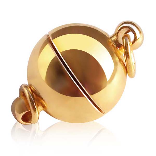 This magnetic ball clasp has 2 sizes. 8mm or 10mm. It is made with a base metal and is then over layed with 18k gold in order to stay tarnish-free. It is perfect for a necklace or bracelet for easy-wearing.