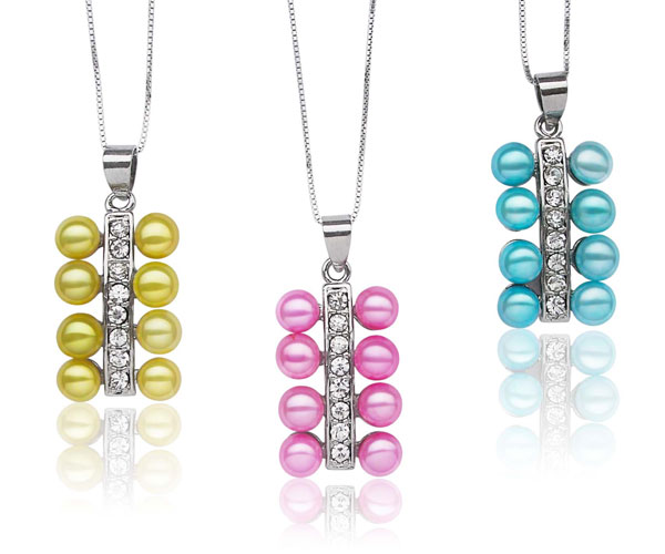 Three colors of pearls are available: dark olive green, hot pink, and turquoise.