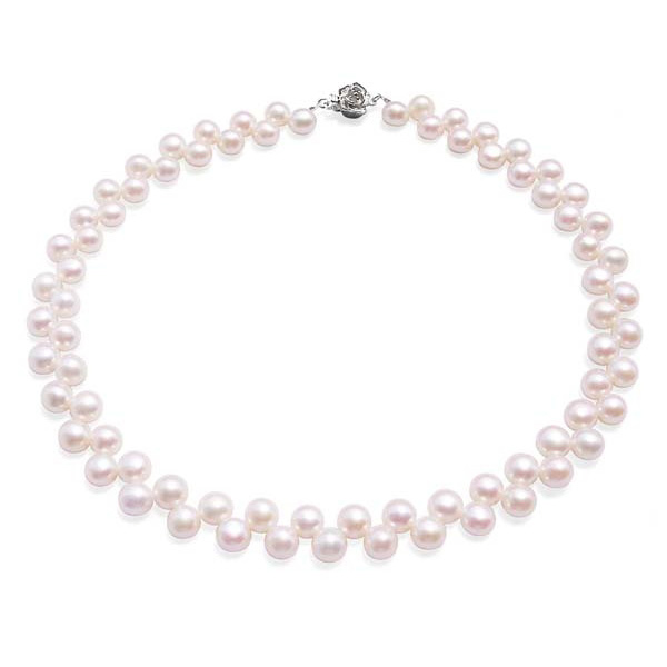Cascading iridescent garland of cultured pearls approx. 6-7mm pancake pearl necklace with 15.5″ long wonderful tone and luster. It is secured by a decorative rose shaped clasp, stamped 925 sterling silver.