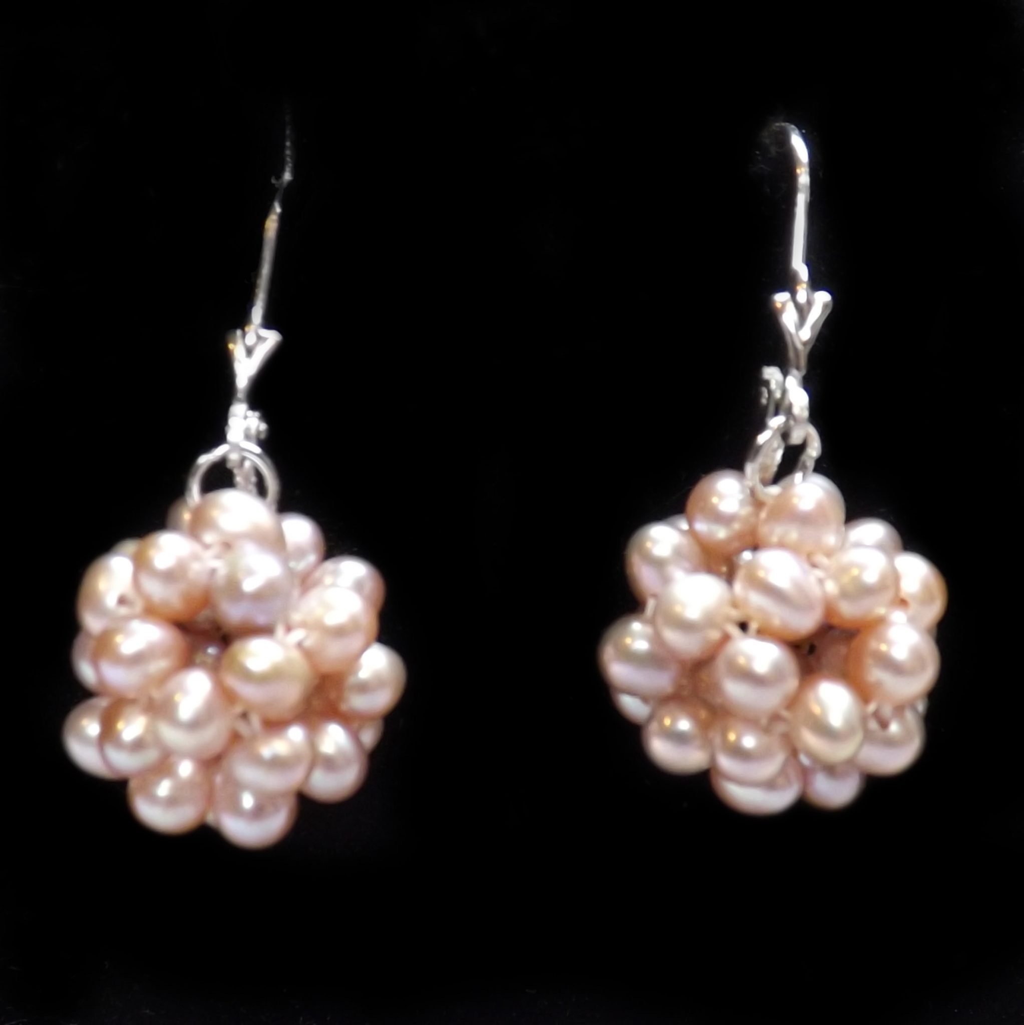 This pair of leverback pearl earrings in silver features more than 20 genuine cultured pearls. Pearls are in semi-round shape and are approximately 3.5-4mm with very high luster.