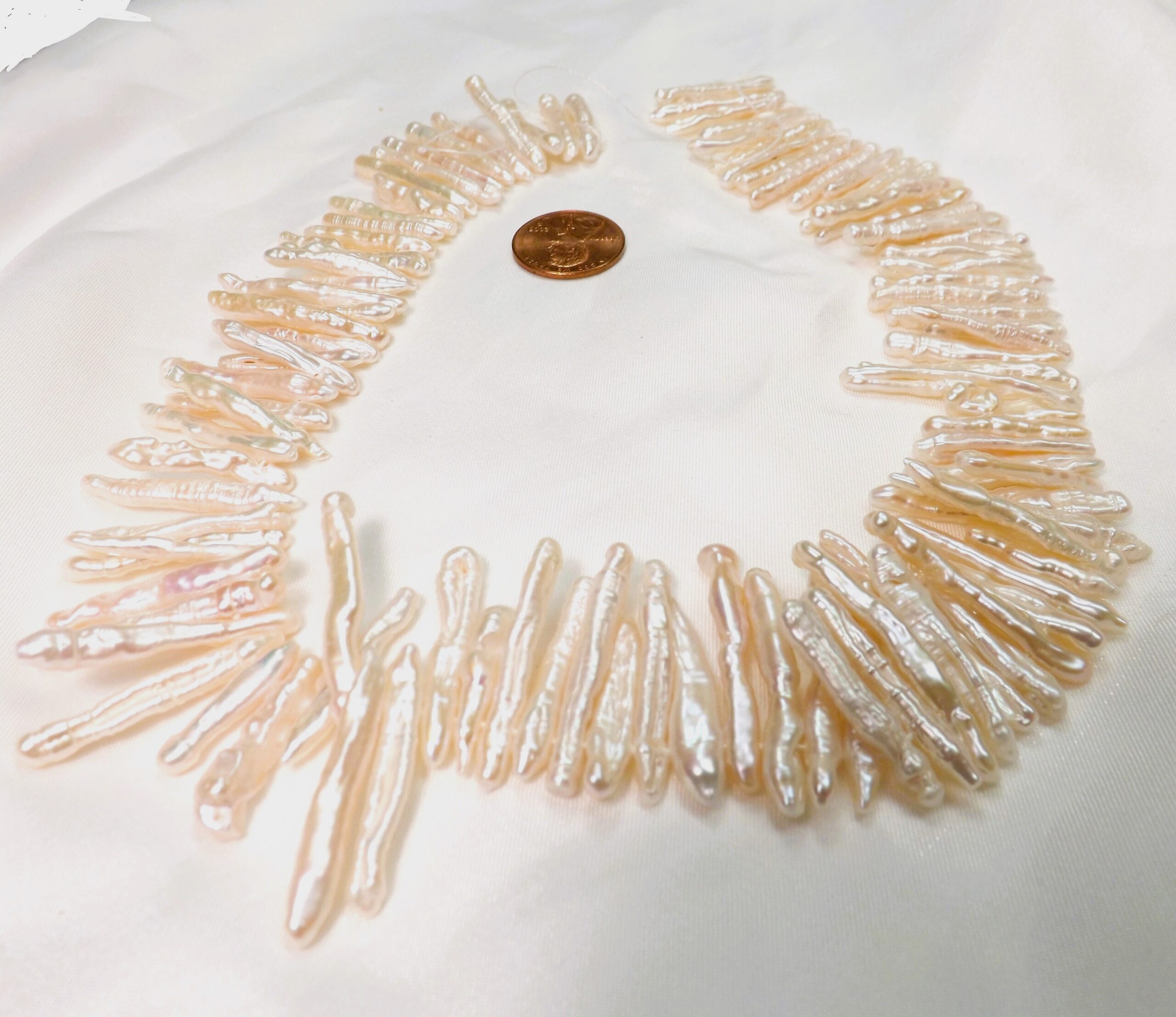 These top-drilled stick pearls are about 20mm in length, and about 5mm wide. Each top drilled biwa pearl strand has approximately 100 pearls at 15.5inch long.
