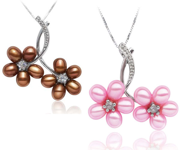 Unique and beautiful Twin Flower Shaped genuine Pearl Necklace Pendant Sterling Silver Necklace.