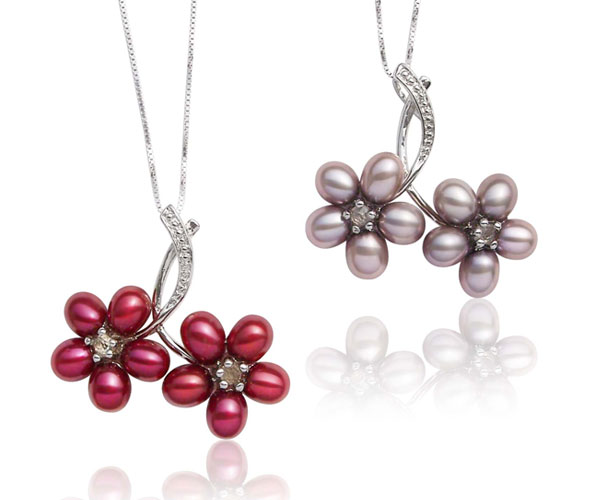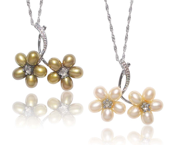 With a twin flower shaped design, this pendant is approximately 1 1/2″ x 1 1/4″. These pearls are made of 5-6mm drop shaped freshwater pearls with high luster.