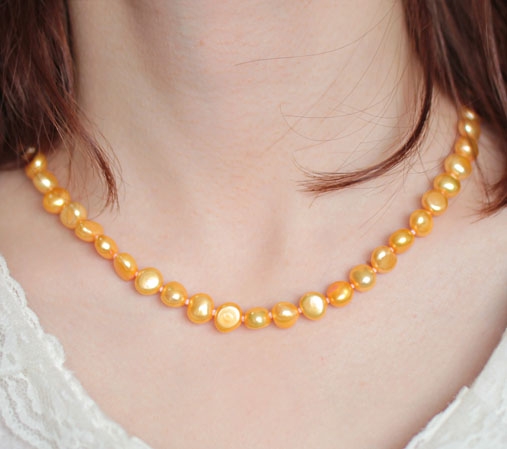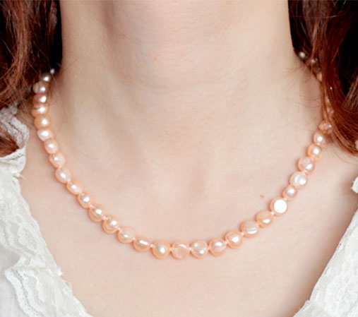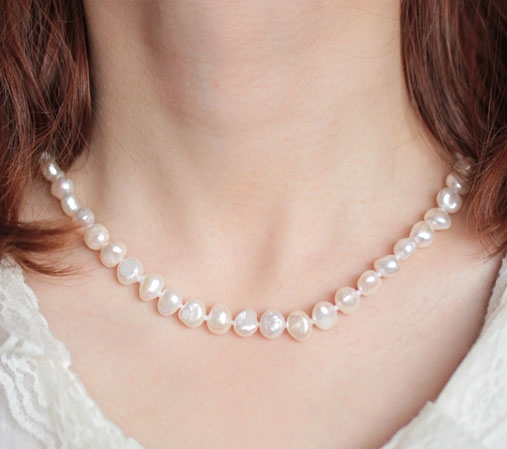 It is made of unusual baroque shaped 8-9mm genuine freshwater pearls at a length about 16.5in-17in long.