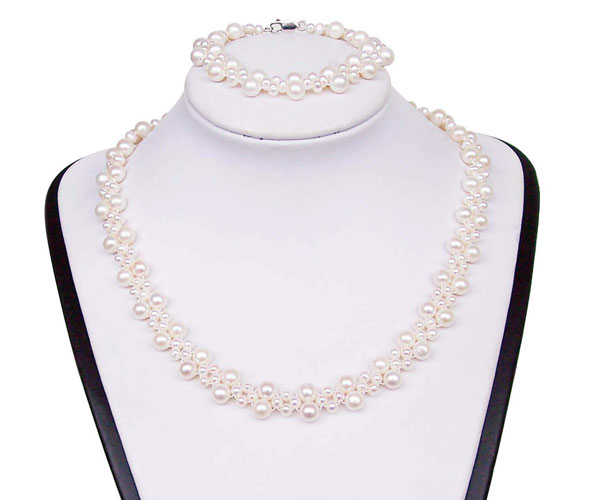 A unique and elegant pearl necklace and bracelet set made of genuine white pearls and finished with 925 sterling silver.